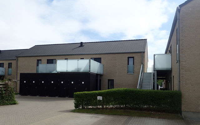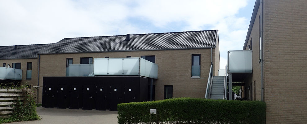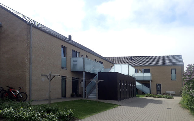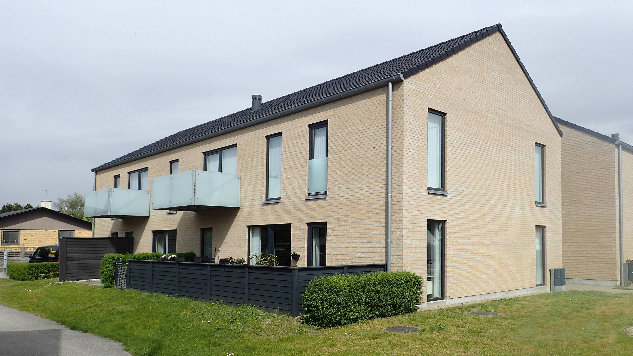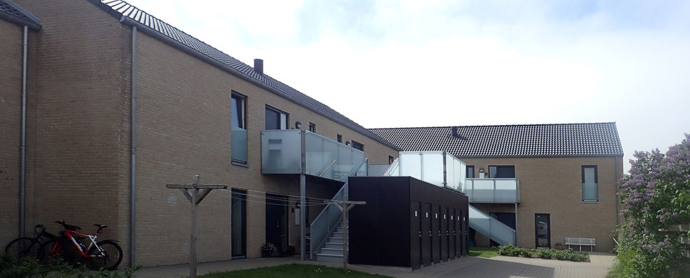 Bebyggelsen er L-formet – opført i to plan med 6 boliger i stueplan og 6 boliger på 1. sal – i alt 12 seniorboliger af 84 m².