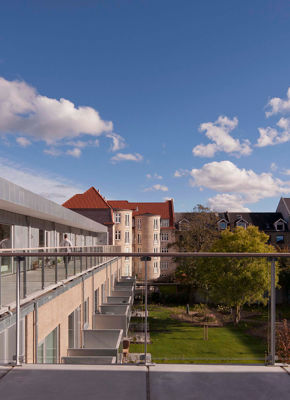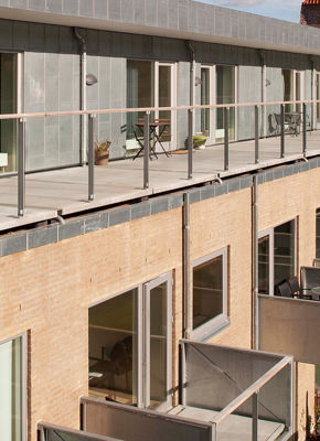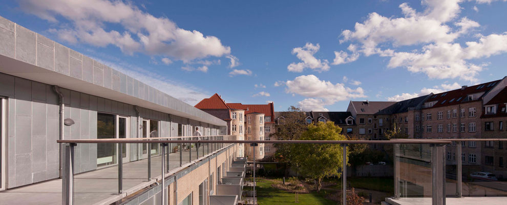 Bygningens tagetage er tilbagetrukket fra facaden; her er opført 12 ungdomsboliger med fælles tagterrasse.