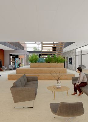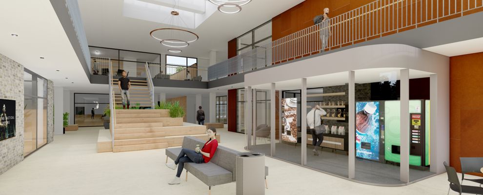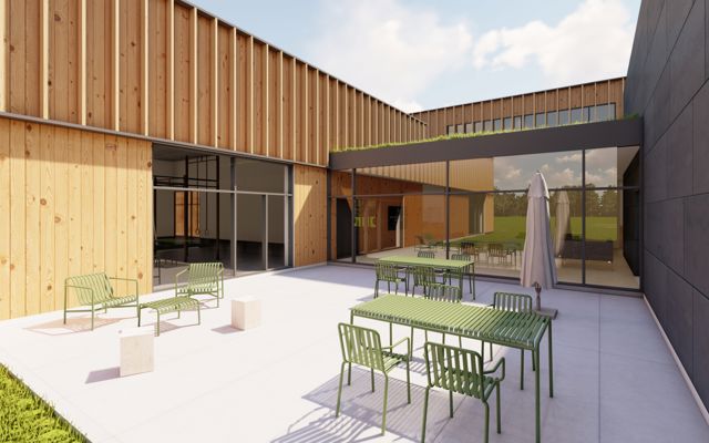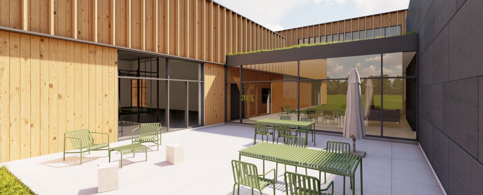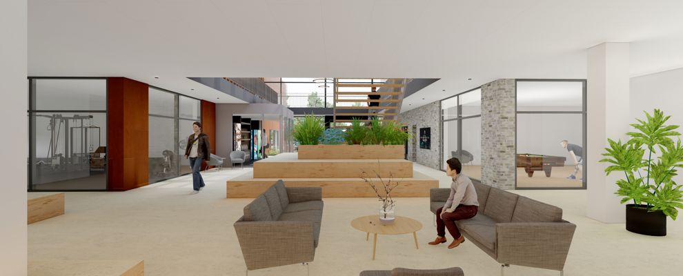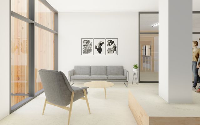 Alle modulerne er beliggende omkring et centralt loungeområde. På denne måde bliver loungeområdet hjertet og nerven i bygningen. I dette område er der både direkte og visuelle forbindelser til alle faciliteterne i både stueplan og 1 sal.