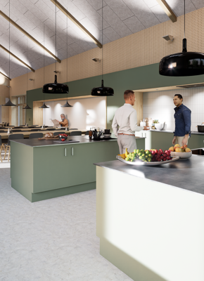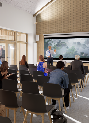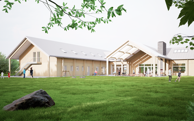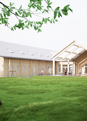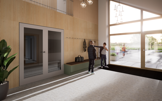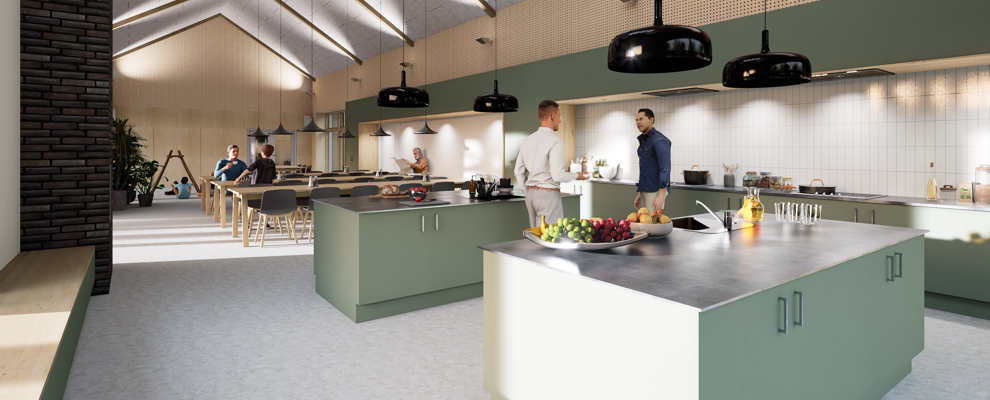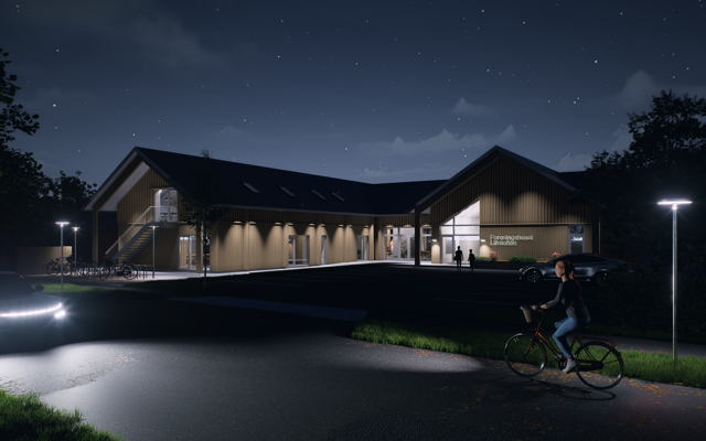 Materialerne er valgt med omtanke for både miljø, indeklima og drift: limtræ i de bærende konstruktioner, træbeklædning udvendigt og varme træoverflader i udvalgte indvendige zoner, der tilsammen giver bygningen et robust og imødekommende udtryk – og en kvalitet, der holder over tid.