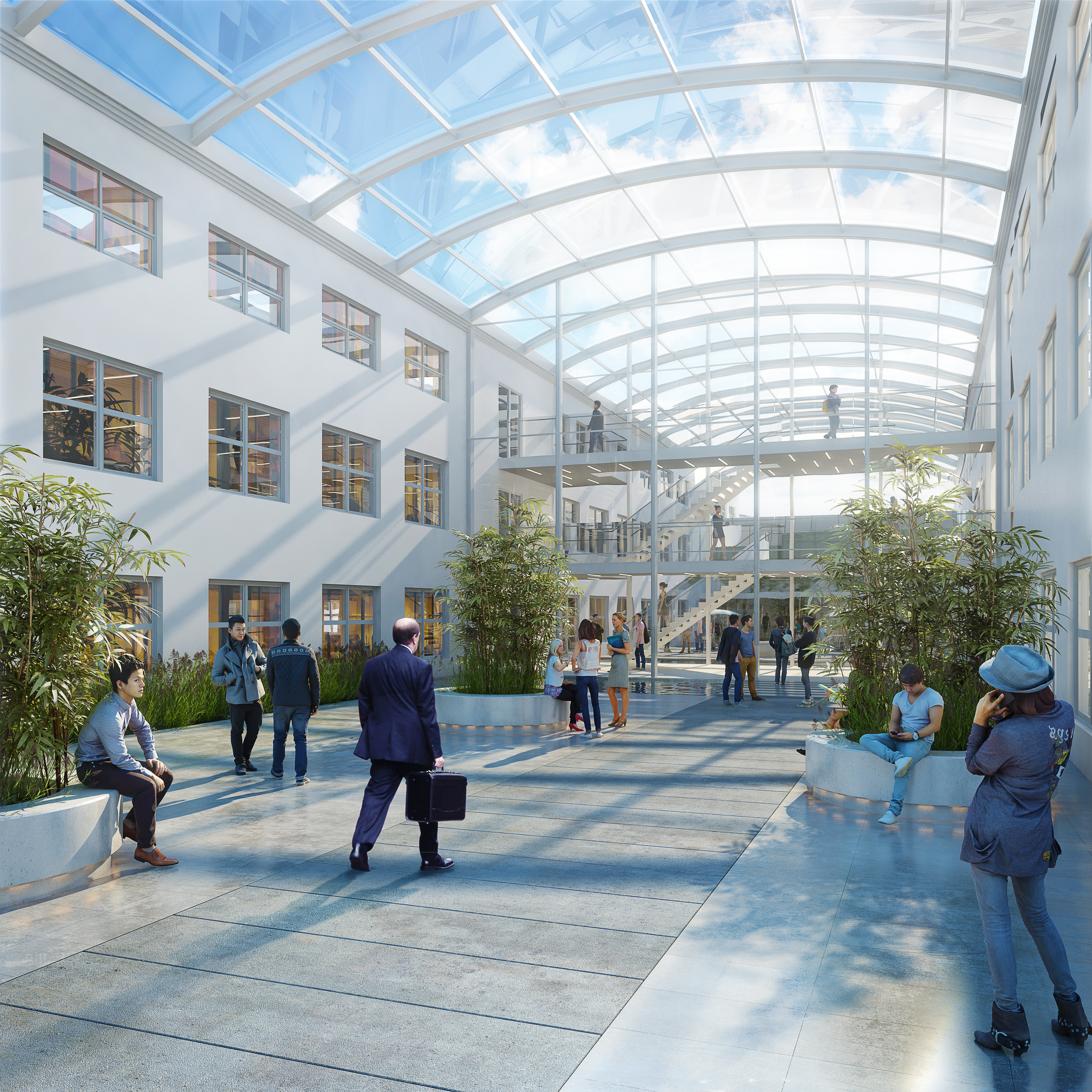 Bygningsanlægget er projekteret i 3 etager og består af en gennemgående centerbygning, der indeholder kantine samt køkkenfaciliteter og kontorer. Adskilt af glasoverdækkede gårdrum til ophold, er projekteret to bygninger, der indrettes til kontorformål med fokus på fleksibilitet.