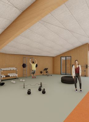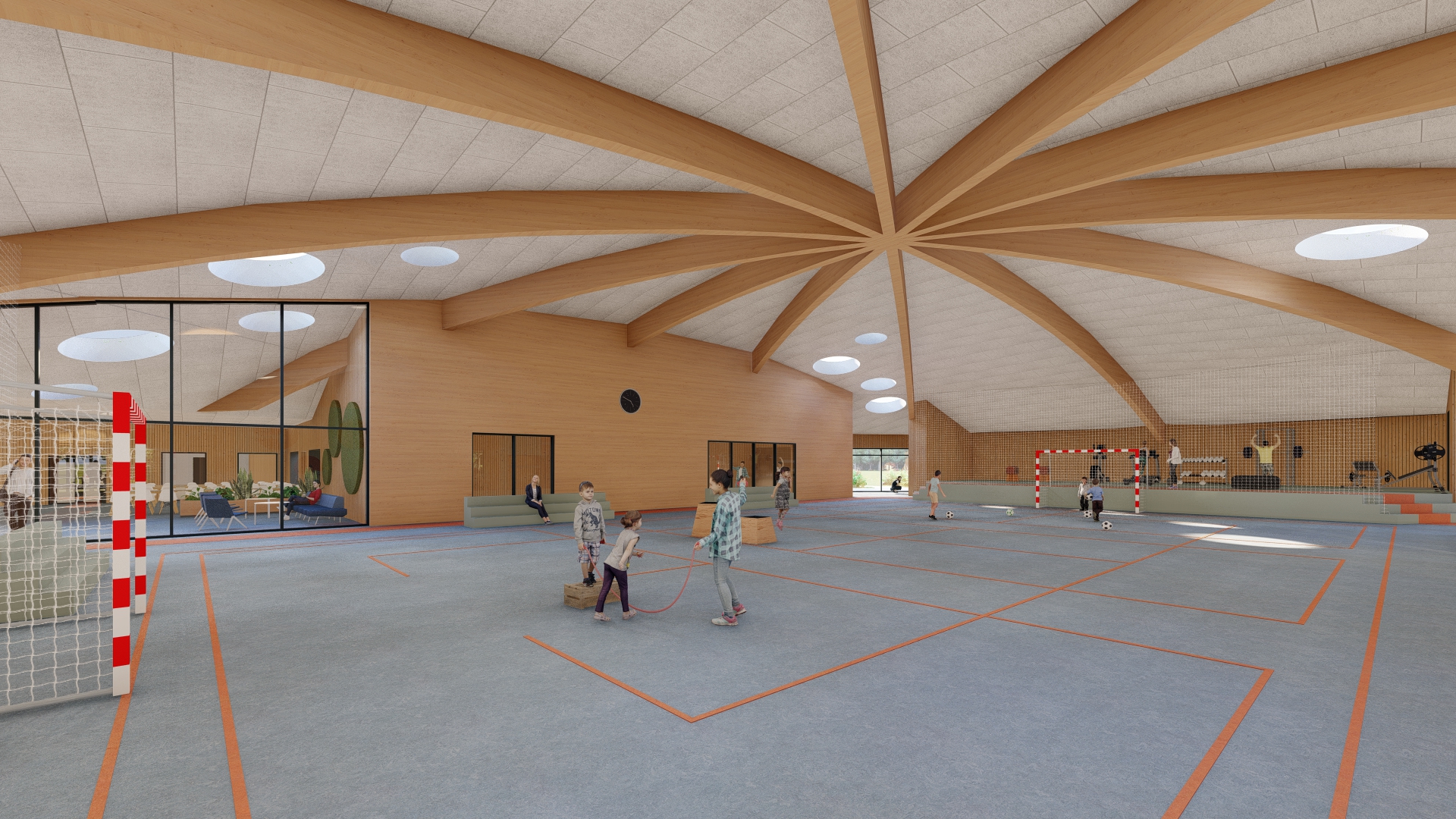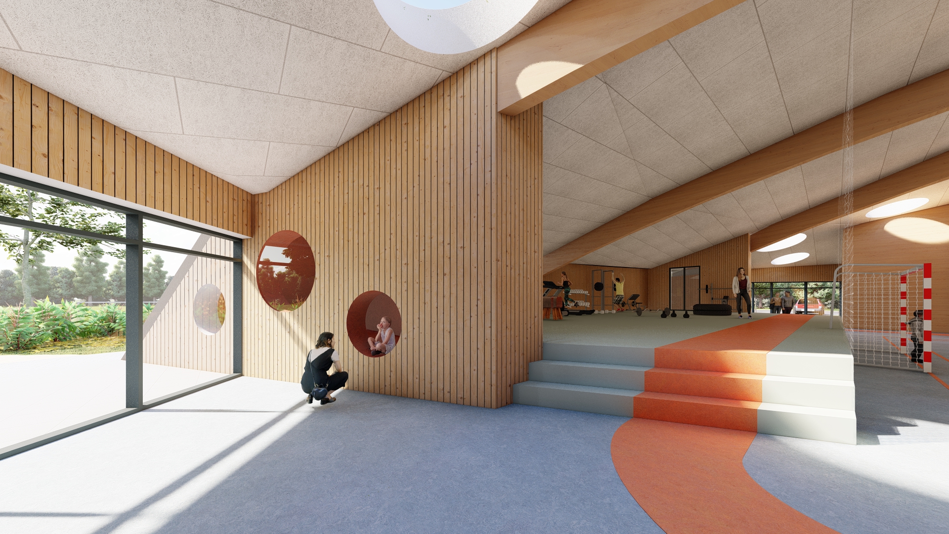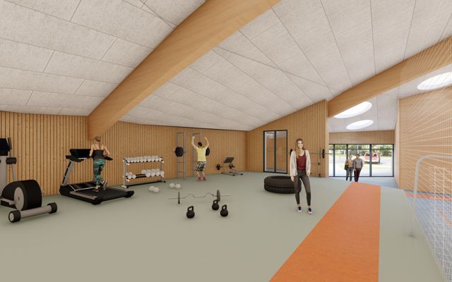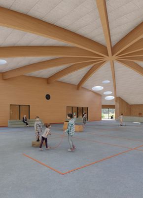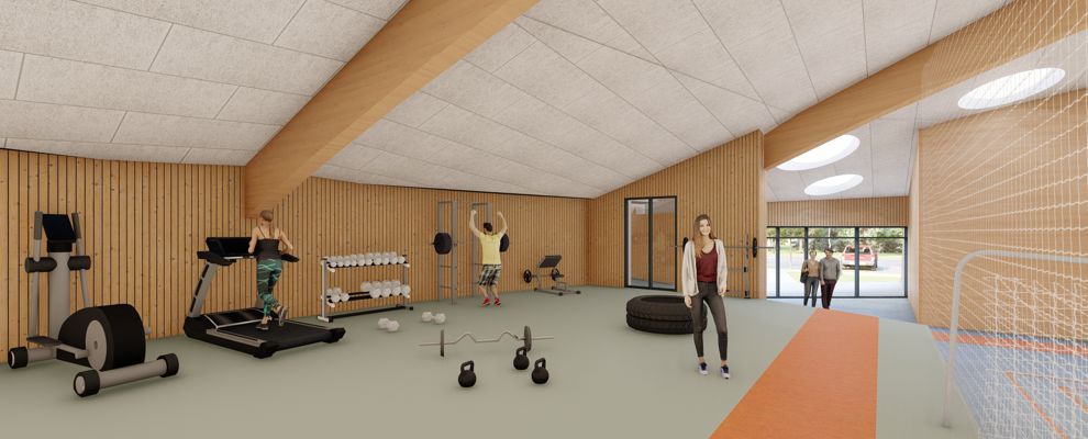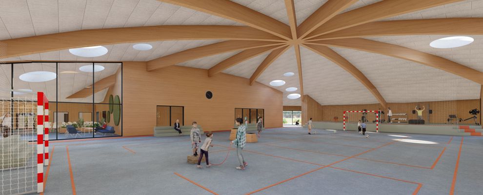 Den nye bygning bindes til den eksisterende del gennem cafeteriet, der renoveres og udvides. Hallen bliver centrum i bygningen, hvortil de resterende rum placeres rundt herom. Halgulvet omkranses af en løbebane, der ligeledes agerer gangareal. Taget formes som en kuppel, hvilket giver overdækkede uderum og god rumlighed indenfor i bygningen.