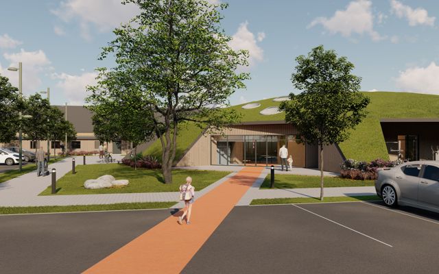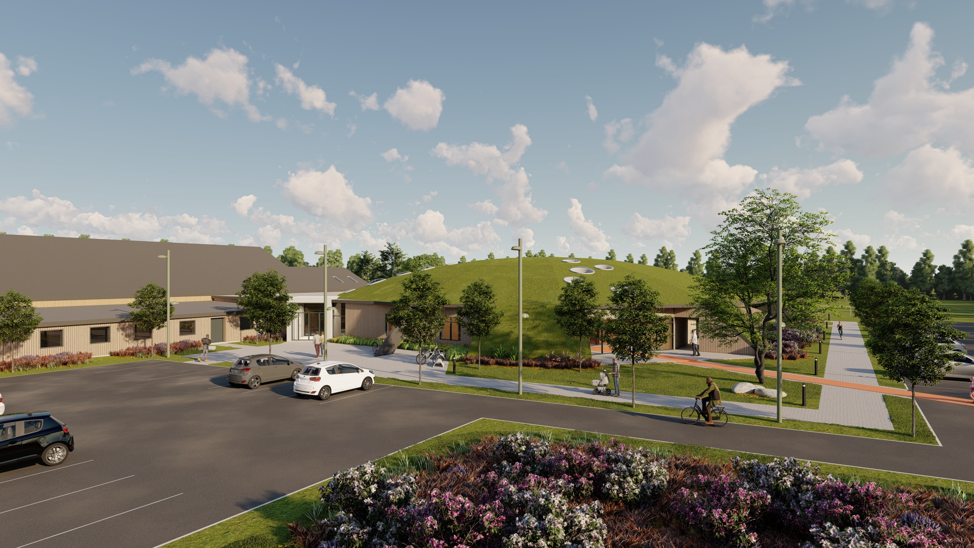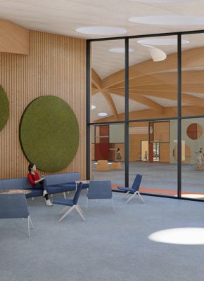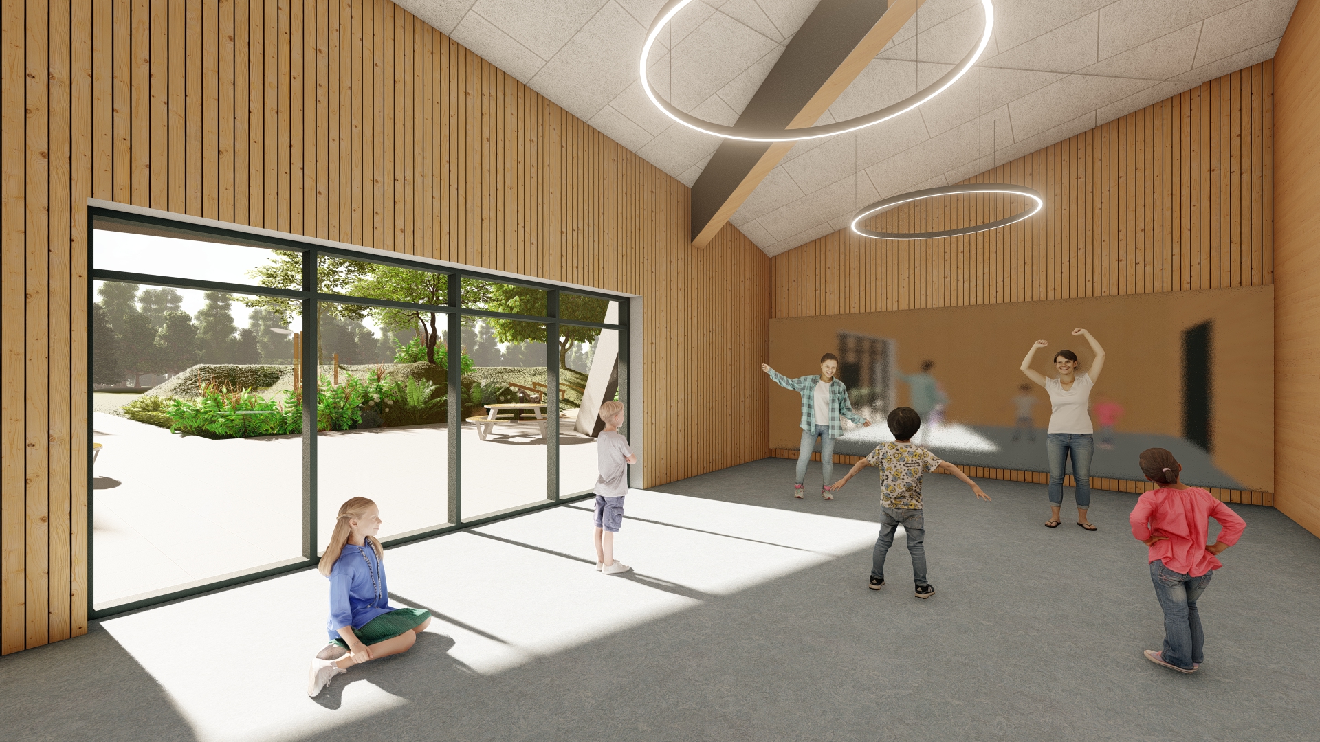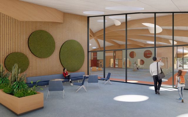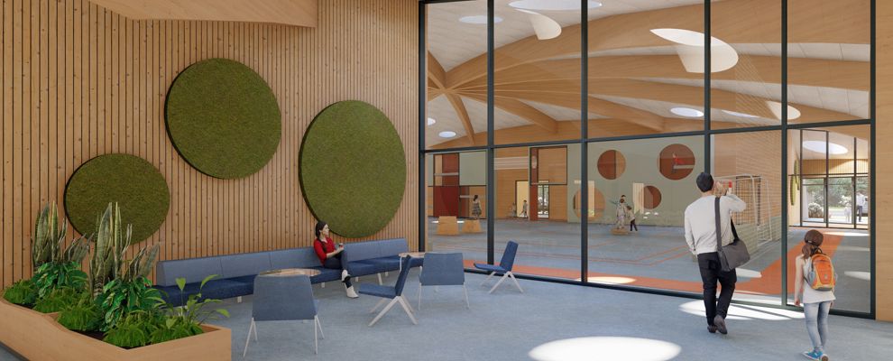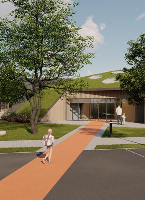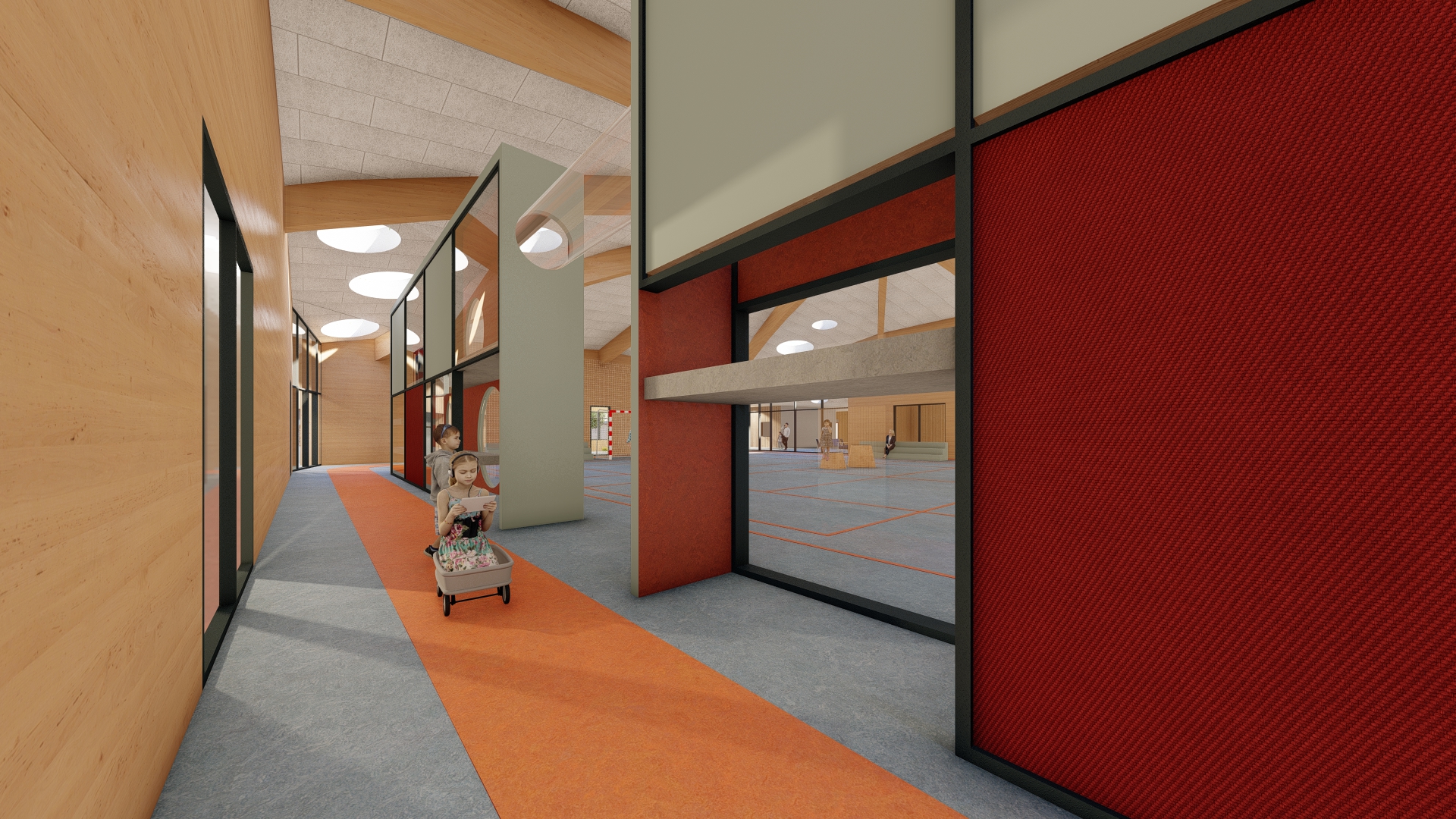 Den nye bygning bindes til den eksisterende del gennem cafeteriet, der renoveres og udvides. Hallen bliver centrum i bygningen, hvortil de resterende rum placeres rundt herom. Halgulvet omkranses af en løbebane, der ligeledes agerer gangareal. Taget formes som en kuppel, hvilket giver overdækkede uderum og god rumlighed indenfor i bygningen.