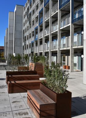 Boligerne er orienteret med adgangsarealerne mod sydsiden, med ankomst fra plinten, hvor aktiviteten, der foregår på etagerne, bringer muligt liv ind i bebyggelsen.