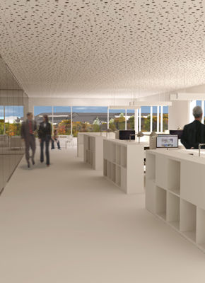 En centralt placeret lysgård åbner for lys og luft, og ligeledes åbnes bygningen i de nederste etager mod P-arealet, så der skabes gode adgangsforhold.